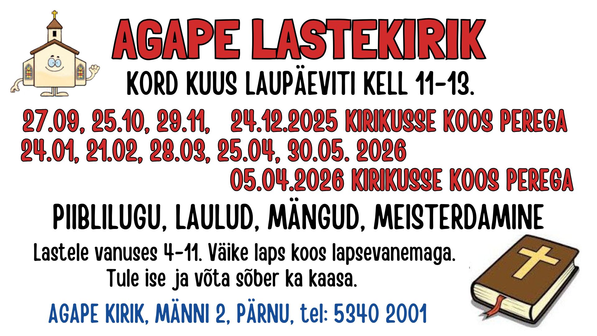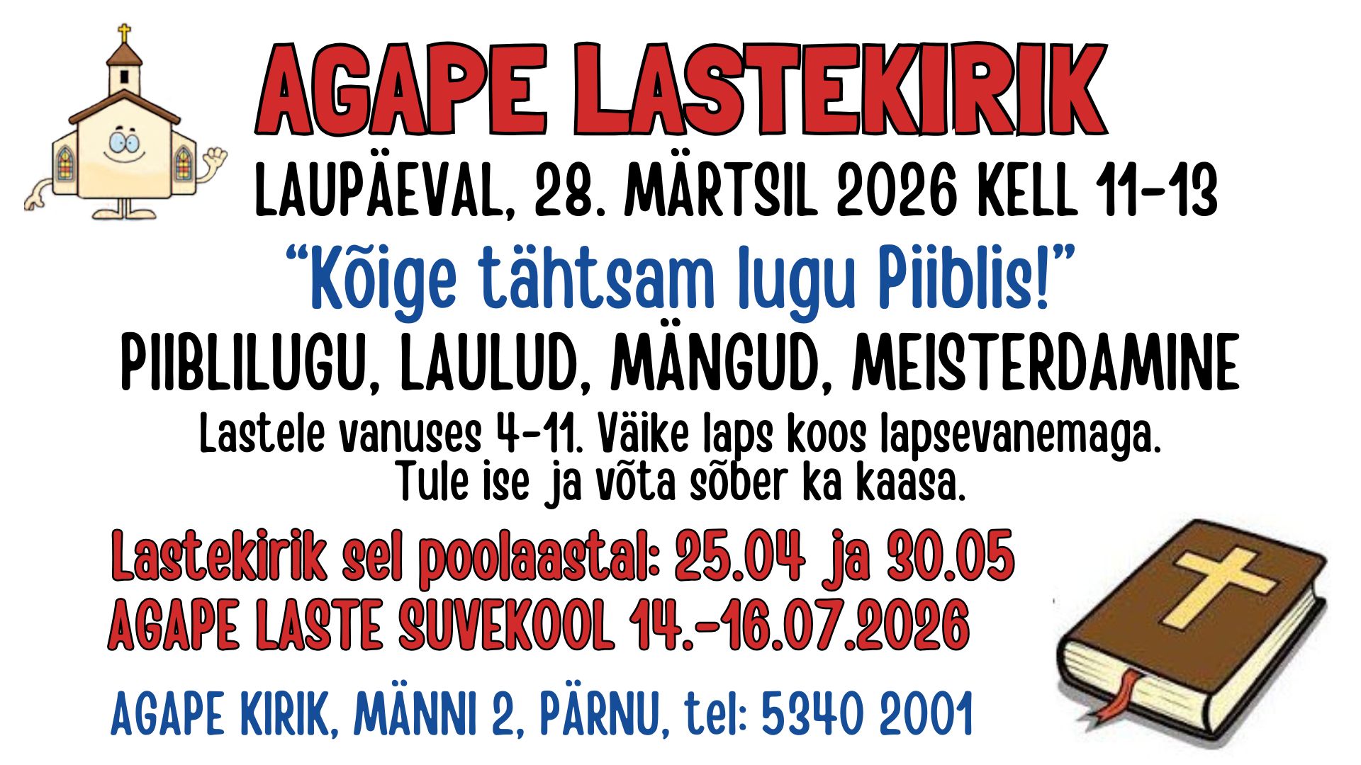 Kord kuus laupäeviti, kell 11-13. Kutsume kõiki lapsi Agape Lastekirikusse. Lastekirikud sellel poolaastal: 28.03; 25.04; 30.05.2026
